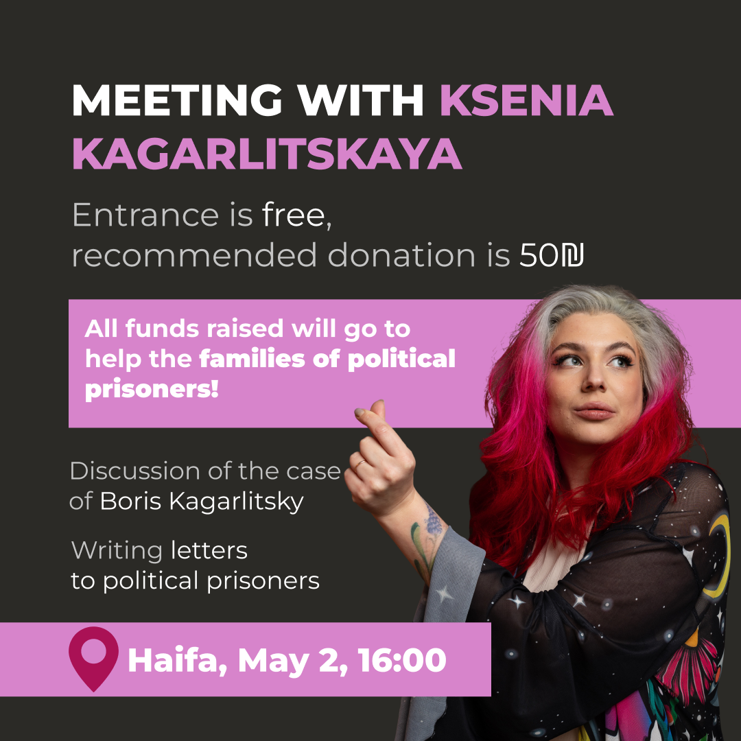 On May 2 at 16:00 I invite you to meet me in Haifa. I am Ksenia Kagarlitskaya, the founder of the Freedom Zone festival in support of political prisoners and the daughter of the famous scientist and public figure Boris Kagarlitsky, who is currently serving a sentence in a Russian prison for anti-war views.